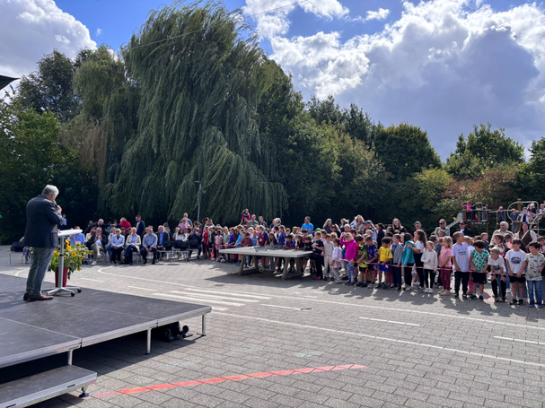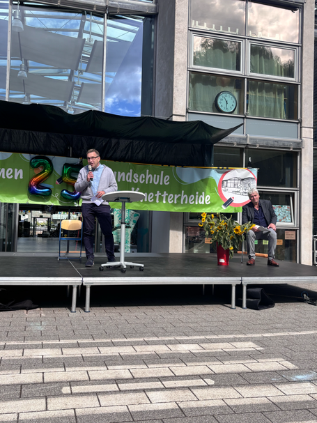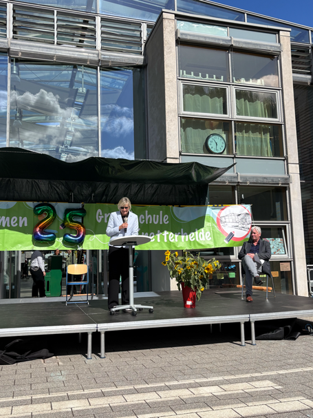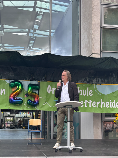 Am Nachmittag folgte der offizielle Festakt, bei dem die Schülerinnen und Schüler mit vielfältigen Beiträgen ihr Können präsentierten. Auch zahlreiche Gäste fanden den Weg in unsere Schule und überbrachten ihre Glückwünsche. Unter ihnen Schulrat Olaf Brodziak, die stellvertretende Bürgermeisterin Christine Fanenbruck sowie Karsten Schlattmeier, der damalige Architekt des Schulgebäudes. In Grußworten wurde nicht nur die Geschichte der Schule gewürdigt, sondern auch der starke Gemeinschaftssinn hervorgehoben, der die Grundschule Knetterheide seit einem Vierteljahrhundert prägt. Vertreterinnen und Vertreter des Lehrerkollegiums, der OGS-Mitarbeiterinnen, des Fördervereins und natürlich die Schülerinnen und Schüler selbst erzählten, was sie an ihrer Schule besonders schätzen.