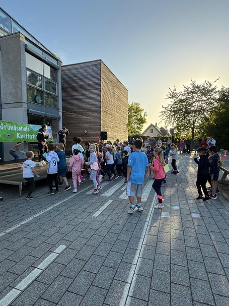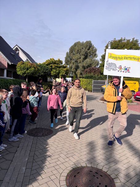 Am vergangenen Freitag feierte unsere Grundschule Knetterheide ihr 25-jähriges Bestehen mit einem bunten Festtag, der ganz im Zeichen von Bewegung, Musik und Miteinander stand. Bereits am Vormittag startete das Jubiläum mit einem Sponsorenlauf, an dem alle Klassenstufen – von der ersten bis zur vierten – im Stundentakt teilnahmen. Vor jedem Lauf sorgte ein gemeinsames musikalisches Warm-up mit Frau Jacobsmeier und Herr Alves Rei für die nötige Energie und gute Laune. Besonders schön: Viele Eltern, Großeltern und Geschwister waren gekommen, um die Kinder lautstark anzufeuern. Die Schülerinnen und Schüler gaben alles und liefen Runde um Runde mit beeindruckendem Einsatz.