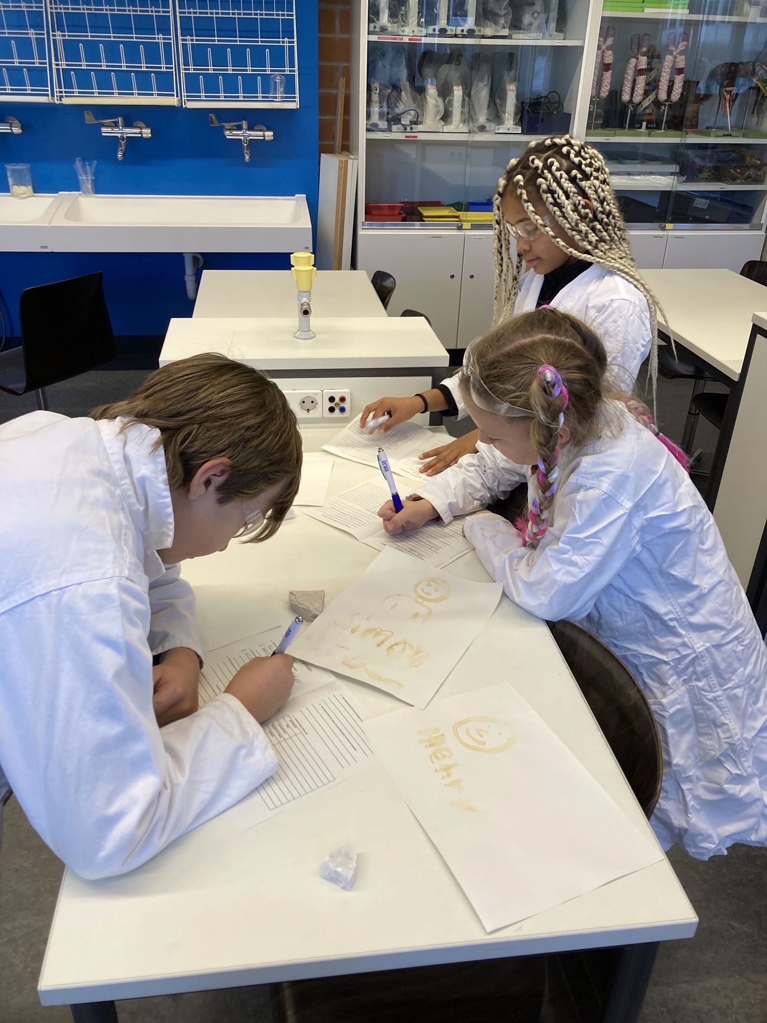 Die Kinder aus dem vierten Jahrgang unternahmen im Oktober und November einen Ausflug in das Aspe Lab der Gesamtschule Knetterheide. Dort erhielten sie die Möglichkeit die Eigenschaften der Zitrone experimentell zu erforschen und waren mit einem Laborkittel und einer Schutzbrille ausgestattet.